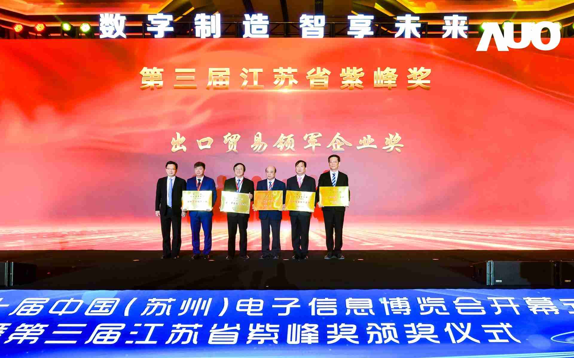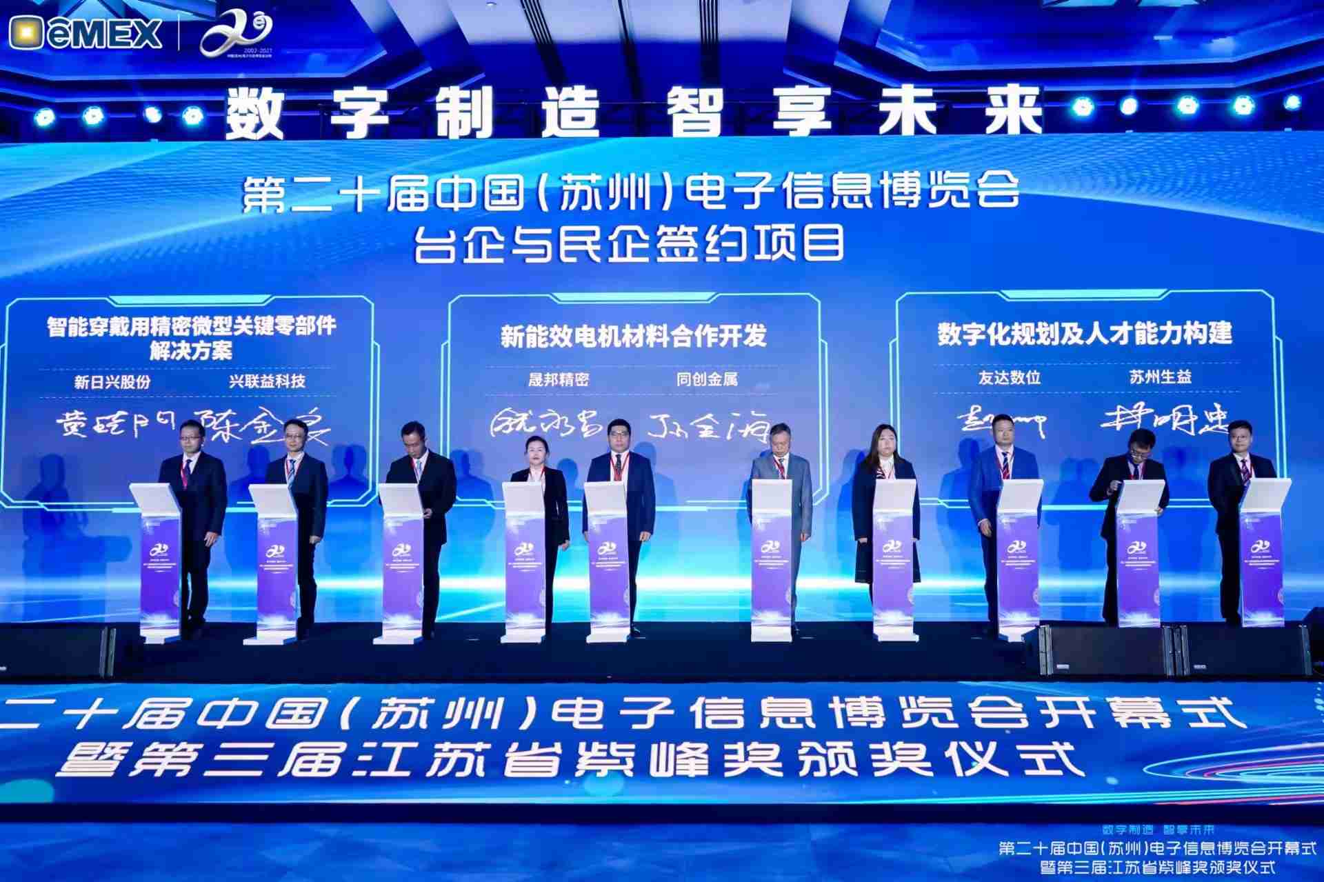 电博会开幕式当天也是第三届江苏省紫峰奖颁奖仪式,,,省台办、、、、工信厅、、、、商务厅、、苏州市相关领导均出席并颁奖。。。该奖项为表彰对江苏高质量发展做出积极贡献的在苏企业,,,,由江苏省政府专门设立。。。尊龙集团光电 (苏州) 总经理郭振明代表上台领奖,,这也是尊龙集团苏州连续三次蝉联紫峰奖 出口贸易领军企业奖。。尊龙集团数位总经理赵丽娜女士,,也参与本次开幕式,,,,上台为本地化赋能签署战略合作协议,,将优质服务资源集合、、、、下沉到更多细分行业,,为更多地区的制造企业提供数字化转型服务。。。。