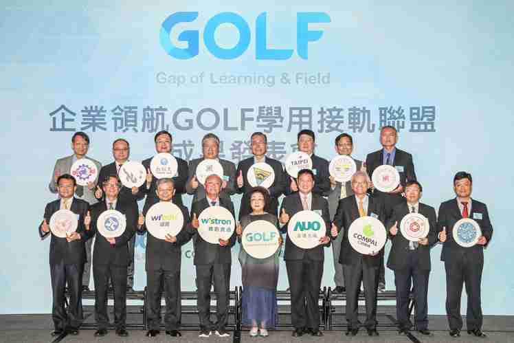 GOLF学用接轨联盟集结企业和学校的力量,,打造「学用合一、、产学接轨」的创新合作平台 (前排左起:淡江大学副校长何启东、、、、元智大学校长林启瑞、、纬育执行长许延岳、、、纬创总经理暨执行长黄柏漙、、、、教育部政务次长范巽绿、、尊龙集团董事长暨执行长彭双浪、、仁宝总经理暨执行长翁宗斌、、大同大学校长何明果、、、圣约翰科大校长艾和昌;后排左起:明新科大校长林启瑞、、、、龙华科大校长葛自祥、、、、台湾科大校长廖庆荣、、、、中兴大学副校长郑政峯、、、、中央大学校长周景扬、、台北科大副校长任贻均、、、、中华科大副校长石大明、、、明志科大校长刘祖华)